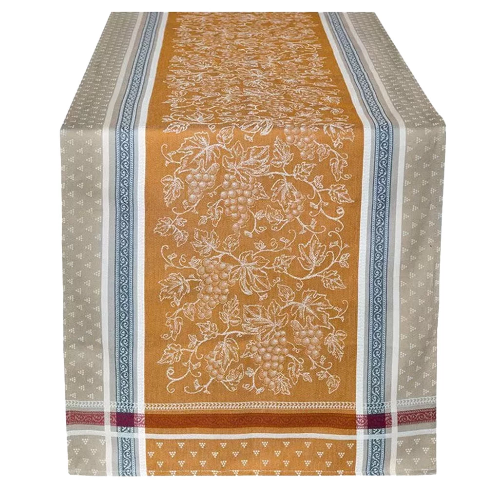 The Wineryjacquard collection captures the color and spirit of Provenal living. This table runner is yarn-dyed and damask-woven for beauty and durability. The beautiful Winery Carameldesigndepictsgrapes on caramel and taupebackgrounds.