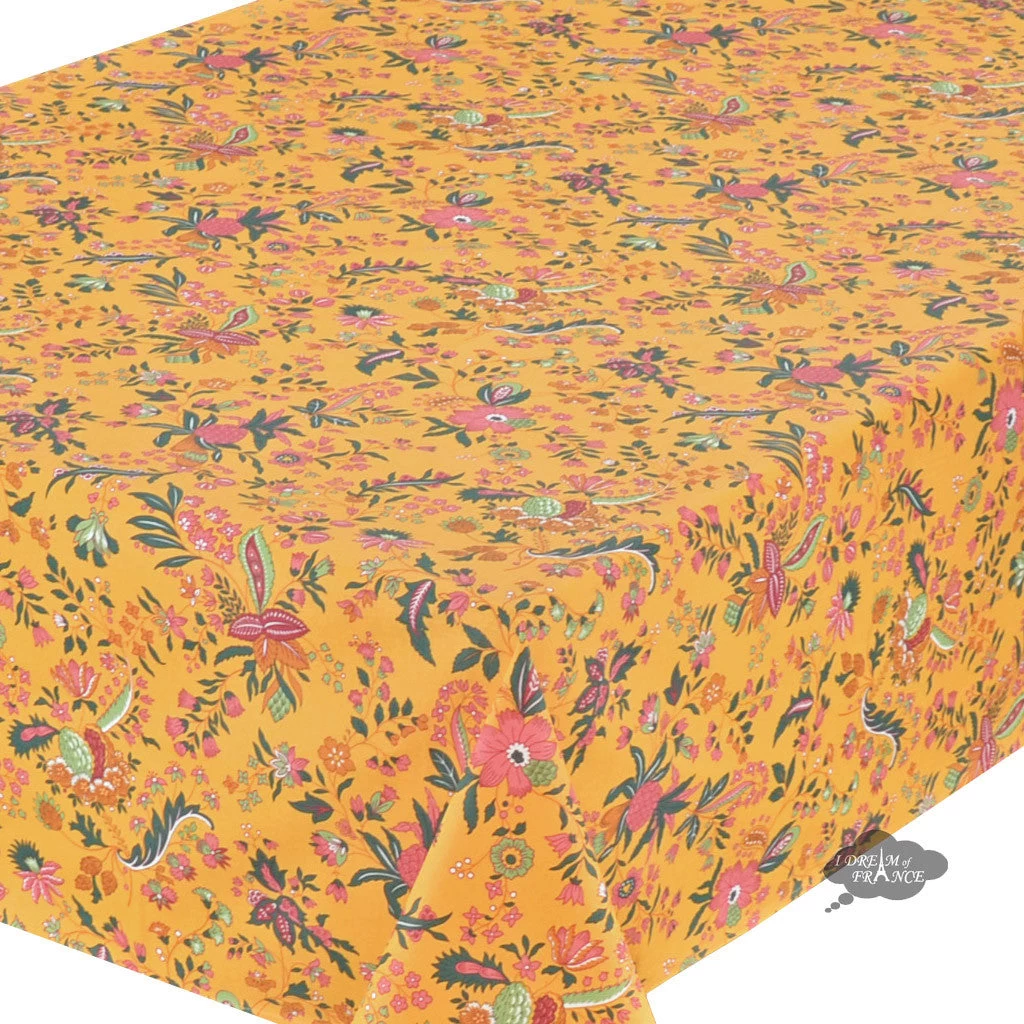 From Le Cluny French Country Collection, the Versailles coated tablecloth is fit for royalty! It features an indiennes or jacobean pattern on a mustard yellow background. It is 100% cotton coated with acrylic to make it stain resistant and long lasting. Spills will not go through, protecting your table. Cleanup is as easy as wiping it with a sponge. UV resistant, they will not fade and are perfect inside or outside.