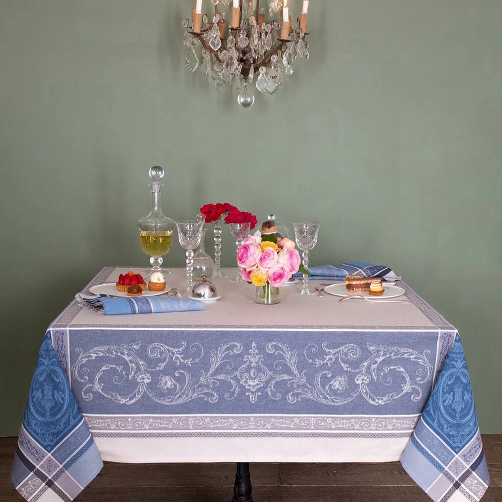 The Versaillesjacquard table linens capture the color and spirit of French living. This tablecloth is yarn-dyed and damask-woven for beauty and durability. It is treated with Teflonto make it stain resistant and to protect your table. The beautiful and sophisticatedVersailles gray and blue design depicts decorative scrolls on a warm gray andmultiple blue tones background.