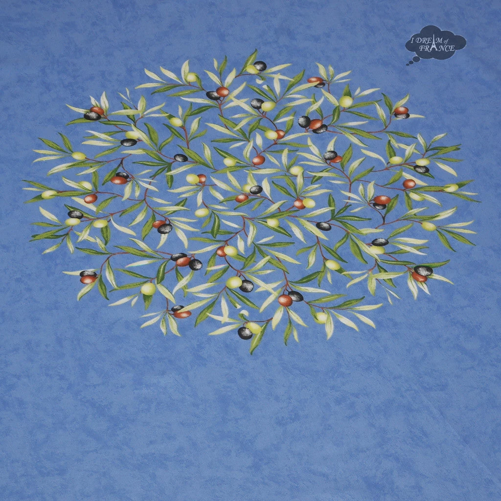 From Provence, this tablecloth features bright and cheerful olive branches on a blue background. It is 100% cotton and is available with or without stain resistant coating. With the optional acrylic coating, spills will not go through, protecting your table. Cleanup is as easy as wiping it with a sponge. UV resistant, they resist fading and are perfect inside or outside. This tablecloth measures 70″ in diameter, and will fit most round tables up to about 52 inches in diameter. It can be ordered with an umbrella hole; please seeoptions below. Both coated and un-coated are machine washable and should be line dried.Made in France.May be labeled as “L’Ensoleillade” or “Label France”.