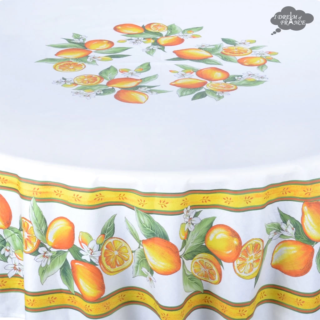 70″ Round Lemons White French Acrylic-Coated Tablecloth By Tissus Toselli