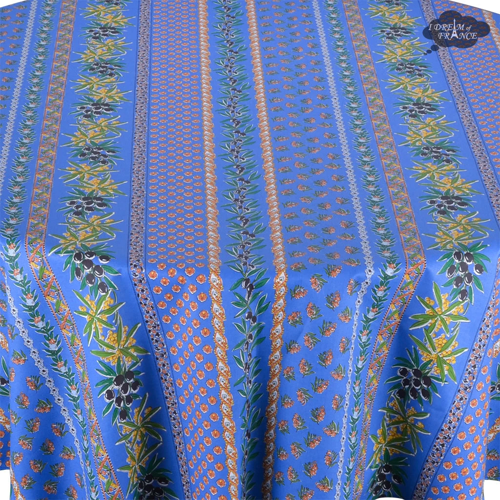 Enjoy summer all year round! From Le Cluny French Country Collection, this coated tablecloth will transport your table to sunny Provence. It features olives and mimosas on a blue background. It is 100% cotton coated with acrylic to make it stain resistant and long lasting. Spills will not go through, protecting your table. Cleanup is as easy as wiping it with a sponge. UV resistant, they will not fade and are perfect inside or outside.