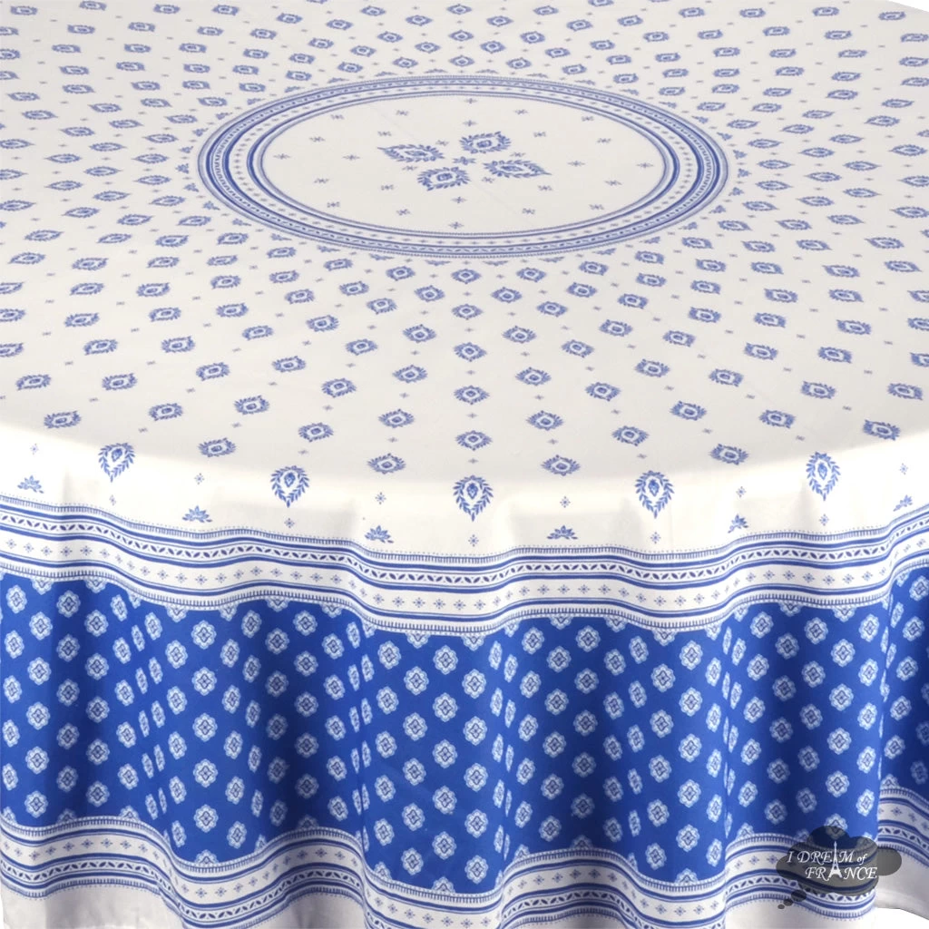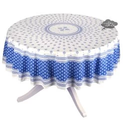 70″ Round Sormiou Blue & White Acrylic-Coated Cotton Tablecloth By Label France