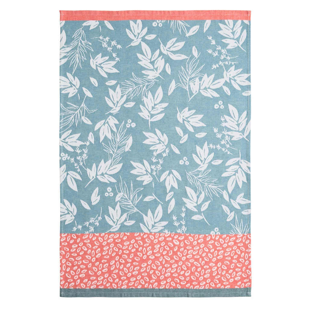The Feuillage Bleu (Blue Foliage)jacquard dish towel fromCouckewill brighten your kitchen and your day. This salmon and blue towel measures 20″ x 30″ and features a detailed illustration of foliage woven into the towel.Beautiful and soft, this towel will serve you well.