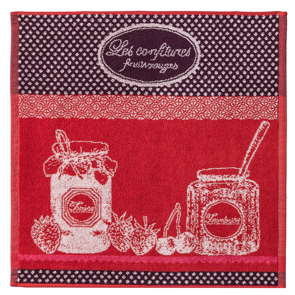 From Coucke, a square terry towel for your kitchen, great for wiping down counters, drying dishes, and drying hands. Confiture Fruit Rouge(Red Fruit Jam), features a detail illustration of jam jars and red fruits. The design is woven into the towel, not printed on top, for lasting durability.