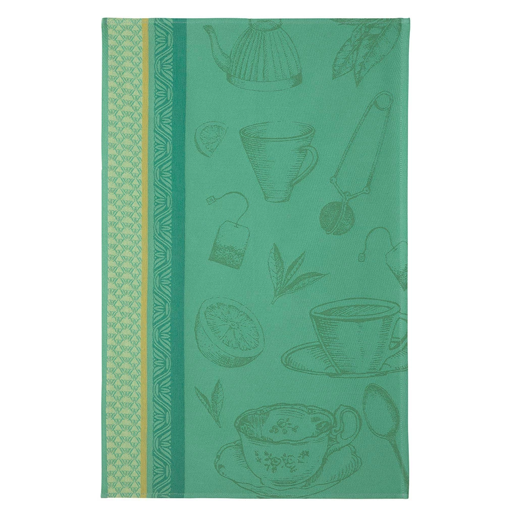 The Mli Mlo Th (Mishmash Tea)jacquard dish towel fromCouckewill brighten your kitchen and your day. This green tea towel measures 20″ x 30″ and features a detailed illustration woven into the towel of a mishmash of tea related items that includes tea cups, a tea pot, tea bags, spoon, infuser, etc… Beautiful and soft, this towel will serve you well.