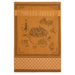 TheMoules Frites(Mussels with fries)jacquard dish towel fromCouckewill brighten your kitchen and your day. Thisgolden brown tea towel measures 20″ x 30″ and features a detailed illustration woven into the towel of a moules-frites dish along with various ingredients andthe obligatory bottle of wine. Beautiful and soft, this towel will serve you well.