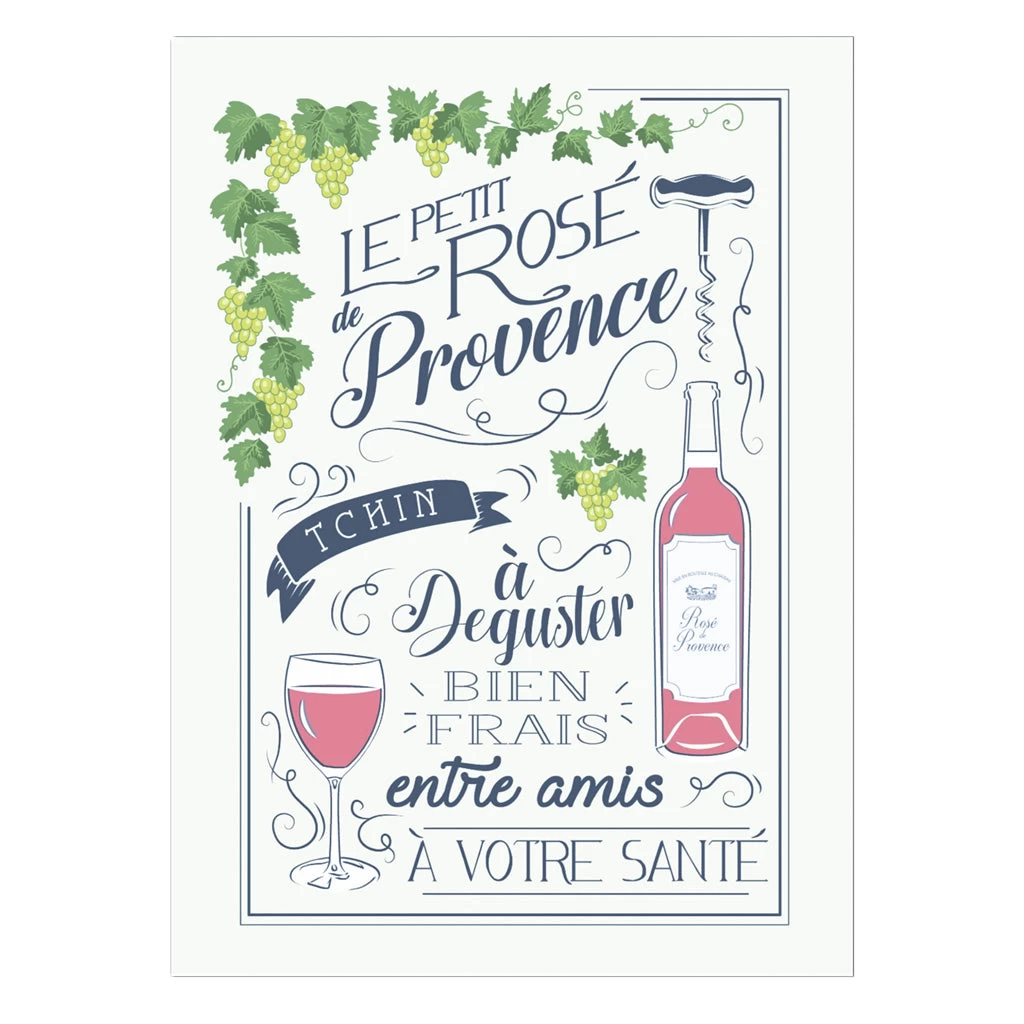 This elegant kitchen towel is printed with aProvence Ros winetheme on a white background. The artwork also include some French expressions : “Tchin” or “Cheers”, “A deguster bien frais entre amis” or “to be enjoyed cold with friends”, or “A votre sant” or “To your health”.The artwork is printed digitally on 100% serge cotton. Measures 19×26″. Made in France.