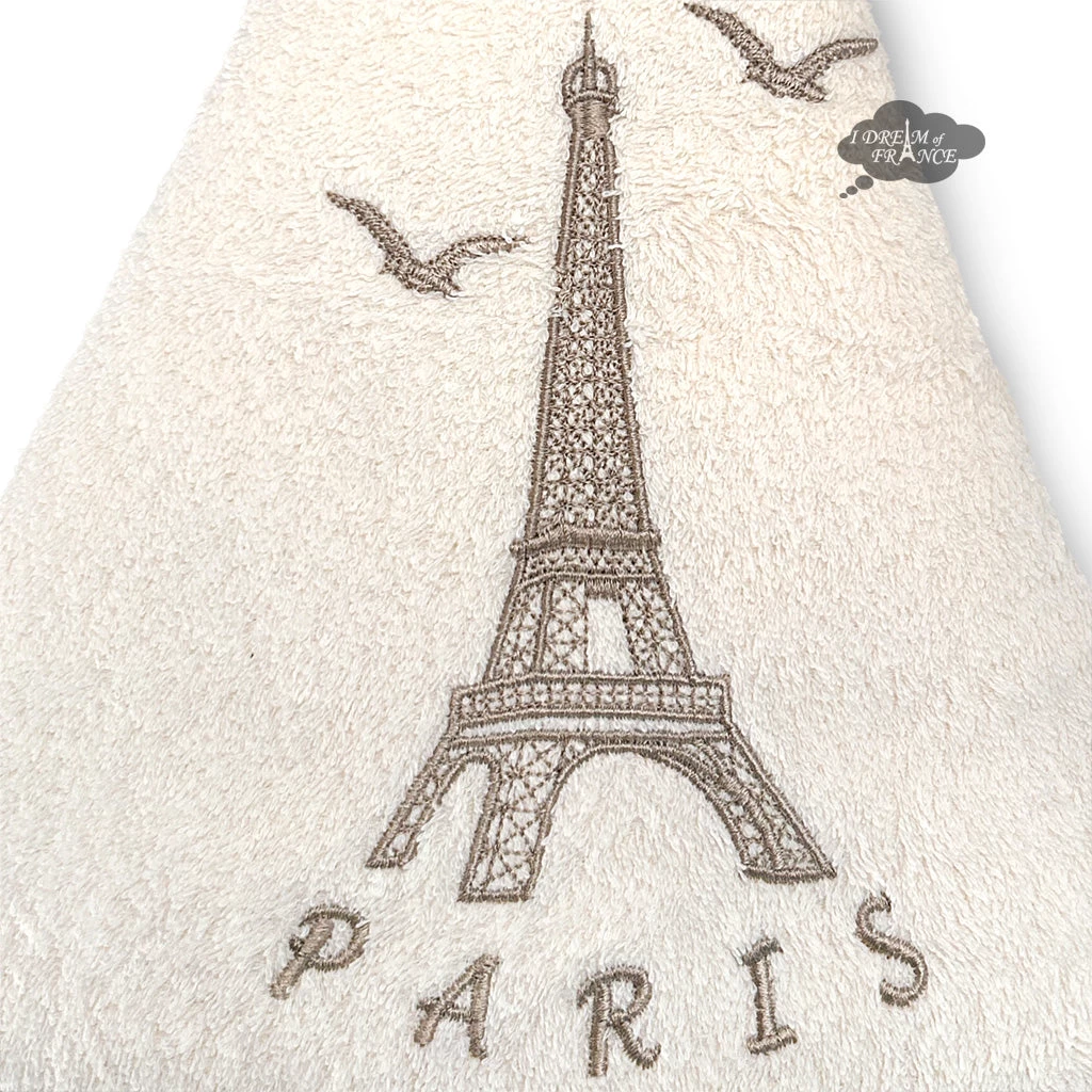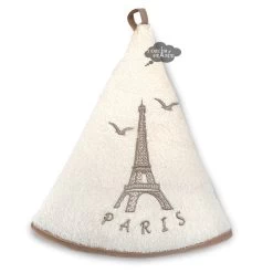 Direct from France, this hand towel is as beautiful as it is practical. In the kitchen or the bathroom, this thick round towel hangs from its center loop on the wall and offers a lot of surface area to dry your hands. This cream towel features a soft terry pattern and is embroidered with the Eiffel Tower in a light graycolor and taupe binding. Measures 26″ in diameter. Designed in France, Made in Turkey.