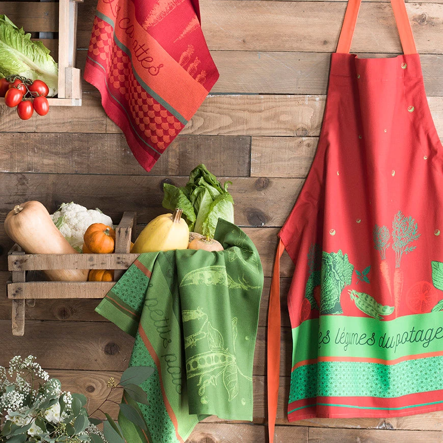 The Lgumes du Potager(Vegetables of the garden) cotton apronfromCouckewillbrighten your kitchen and your day.This redand green apron features a selection of common vegetables. Includes an orange adjustable neck and tie.